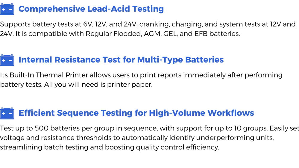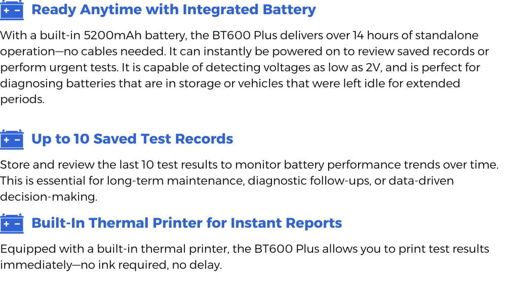BT600 Plus is a professional 2-in-1 Battery & Resistance Tester supporting 6V, 12V, and 24V lead-acid batteries with 99.8% accuracy.Ideal for auto repair shops, battery distributors, and battery manufacturers.