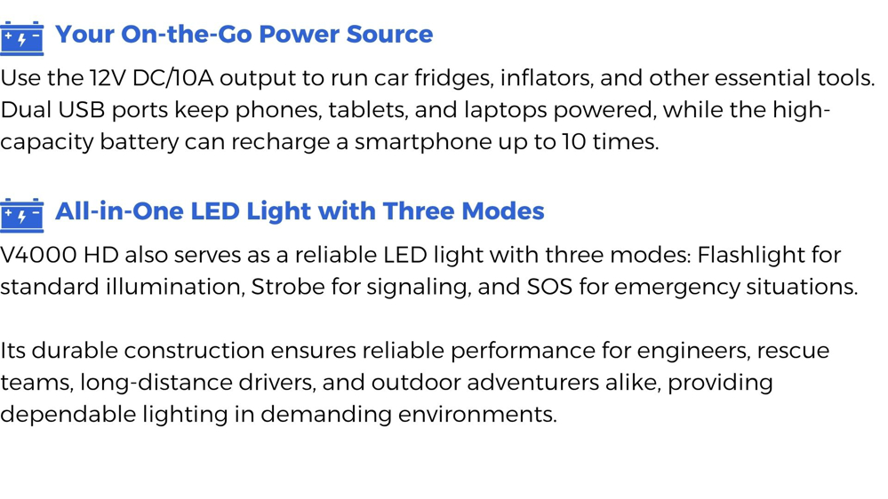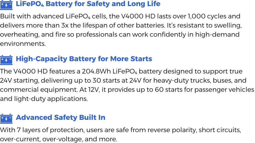 With up to 4,000A of peak current, a rugged 64,000mAh LiFePO₄ battery, and 7 layers of protection, the V4000 HD delivers dependable power wherever it's needed. Fleets, shops, and roadside pros trust the V4000 HD to start fast and stay ready.