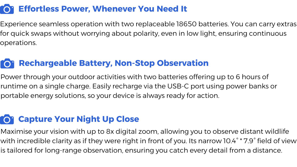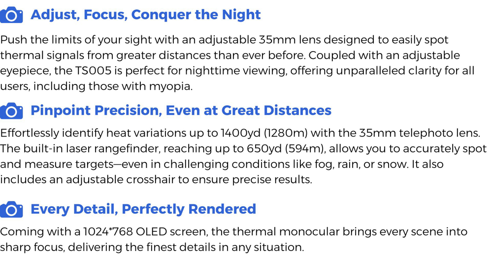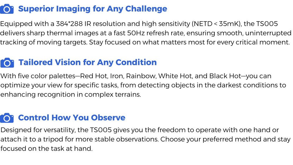 The TS005 is an advanced thermal monocular designed for professionals in wildlife monitoring, search and rescue operations, outdoor adventures, and law enforcement. Whether in the autumn chill or the depths of winter, this robust device delivers consistent performance, allowing you to focus on your adventure with confidence and immerse yourself in the thrill of discovery.